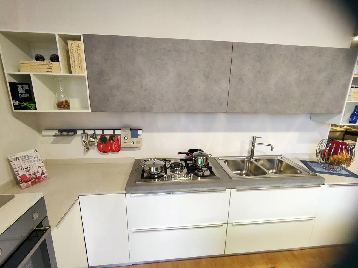 CUCINA BIANCO LUCIDO E FINITURA PORFIDO GRIGIO CON TOP IN QUARZO E LAMINATO PROFIDO GRIGIO